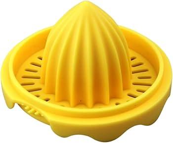 Exprimidor plástico de color amarillo, práctico y resistente, ideal para extraer jugo de naranjas de forma rápida y sencilla. Su diseño manual con filtro integrado permite separar semillas y pulpa, perfecto para el uso diario en la cocina.