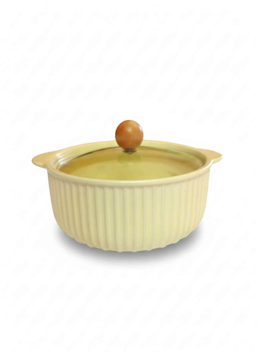 La cazuela de cerámica combina diseño elegante y funcionalidad para tu cocina. Su material resistente mantiene el calor de forma uniforme, ideal para guisos, sopas y preparaciones al horno. La tapa con pomo de madera permite un agarre cómodo y seguro, mientras que su acabado moderno la convierte en una pieza perfecta para cocinar y servir directamente en la mesa.