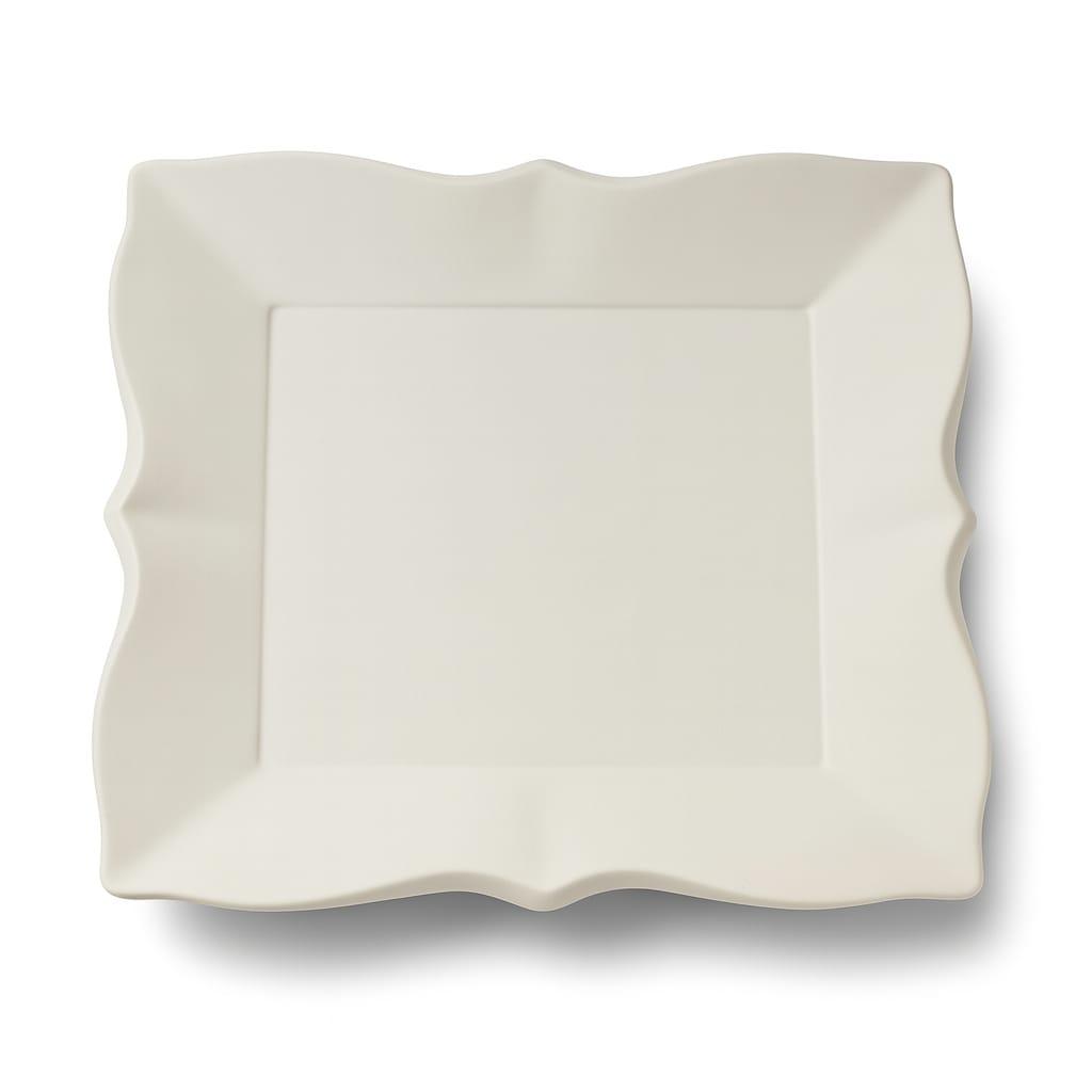 bandeja cuadrada de cerámica blanca con bordes festoneados, ideal para dar un toque sofisticado y decorativo a tu mesa. Su diseño delicado y forma distintiva realzan cualquier presentación, perfecto para uso diario o para ocasiones especiales.