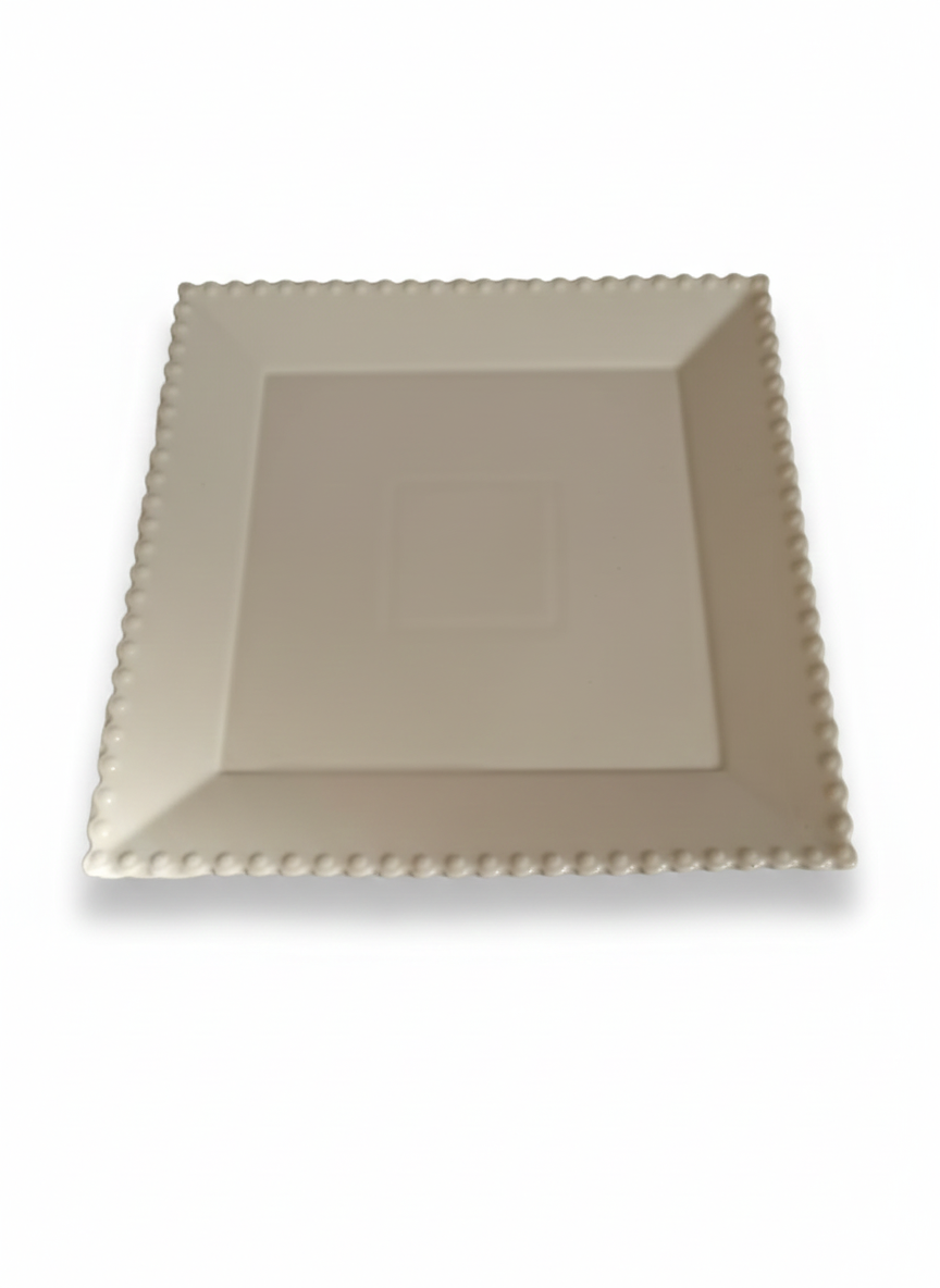 Plato cuadrado de cerámica con borde festoneado, perfecto para dar un toque decorativo y moderno a tu mesa. Su acabado delicado y su forma distintiva realzan cualquier preparación, ideal para uso diario o para presentar platos en ocasiones especiales.