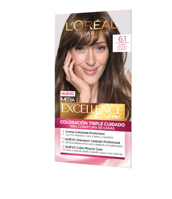 La coloración rubio oscuro cenizo de L’Oréal Paris Excellence Creme ofrece una cobertura total y un tono elegante con matices fríos que neutralizan los reflejos anaranjados. Su fórmula de triple cuidado protege el cabello antes, durante y después del teñido, dejándolo más fuerte, suave y con un color duradero y luminoso.