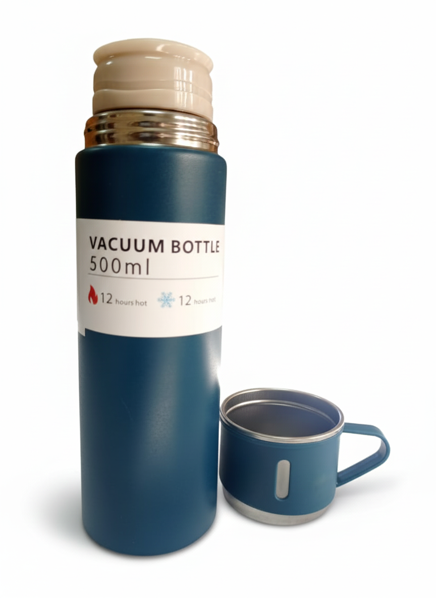 La Termo Vacuum Bottle de 500 ml mantiene tus bebidas frías o calientes por horas gracias a su doble pared de acero inoxidable con aislamiento al vacío. Resistente, ligera y a prueba de fugas, es perfecta para llevar al trabajo, al gimnasio o en viajes. Su diseño moderno y compacto ofrece comodidad y durabilidad en cada uso.